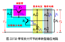 ,组成分压电路,输出电压变化量△UL通过R1、R2分压,取出一部分,加到三极管T2的基极,所以把R1 、R2组成的电路叫取样电路。DZ与R3组成硅稳压电路,提供基准电压UZ。晶体管T2起比较与放大信号的作用,RC为T2 的集电极,T2的集电极输出信号加至T1管的基极,用放大了的"变化量"去控制调整管,调整输出电压的变化,故T2构成比较放大级。