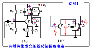 图Z0802(a)为共射调集型变压器耦合振荡电路,(b)是交流通道。图中当不考虑反馈时,由于L1、C组成的并联谐振回路作为三极管的集电极,因此,这种放大电路具有选频特性,常称为选频放大电路。L2为反馈网络,它通过耦合取得反馈信号,并将信号的一部分反馈到输入端,显然,该电路具备了振荡电路的组成环节。