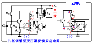 图Z0803(a)是超外差收音机中常用的共基调射式变压器耦合振荡电路,图(b)是它的交流通路。图(a)中Rb1、Rb2、Re是偏置电阻,L5、C组成中频选频回路,它对振荡频率失谐,很小,可视为短路。Cb是高频旁路电容,对振荡信号相当于短路,从而使呈共基接法。L1、L2同C2、C3、Ca组成LC谐振回路。其中Ca为振荡电容,改变Ca的数值,可调节振荡频率。C2为垫整电容,C3为补偿电容,它们是为保证波段的低、高端频率跟踪而设置的,其原理将在第十单元讲述。L3是反馈线圈,为了保证相位平衡条件,变压器同名端应按图中所示接法联接。
