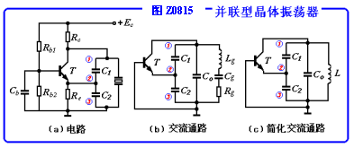 并联型晶体振荡电路如图Z0815所示。振荡回路由C1、C2和晶体组成。由图可知,电路满足"射同基反"的原则,从而构成三点式振荡电路。显然,晶体在回路中起着的作用,亦即晶体必然工作在fS与fp之间。
