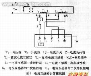 互感器检定装置中有一限流开关,其作用是当工作电流超过额定值或出现故障电流增大时,检定装置会自动跳闸以保护人身及设备安全。有些厂家将限流开关或退磁开关串在被试互感器的二次导线中,使被试二次线经这些开关后连到电流负荷箱和校验仪上。电流互感器台体接线图见图1。