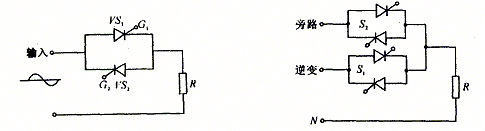 大多数UPS电源的静态开关是由两个反向并联的晶闸管组成的,如图所示。其工作原理较为简单,当其输人端为正弦波电压正半周时,晶闸管VS1的栅极触发脉冲使VS1正向导通向负载R 提供正半周供电。