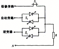 UPS电源中逆变器输出静态开关与旁路静态开关的并联工作方式如图所示。当逆变器正常工作时,通过静态开关S1为负载R供电,逆变器因故障退出供电时,静态开关Sl关断,旁路静态开关S2导通继续为负载供电。这种静态开关与其检测控制电路相配合使用,可使大中型UPS电源的逆变与旁路切换时间达到1ms甚至更短。一般大中型UPS电源为了在主机检修时不中断对负载的供电而设置了检修旁路动态开关。UPS电源逆变器输出静态开关、自动旁路静态开关和检修旁路动态开关的连接方式如图所示。UPS电源正常工作时逆变器的输出静态开关S1导通为负载供电。