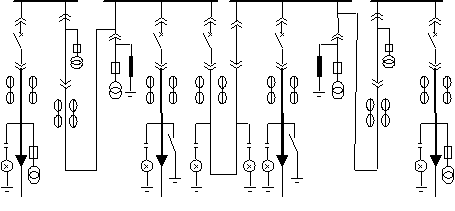 对于受电变压器总容量超过600kVA的中型企业的变、配电所可采用单路电源供电,单母线用隔离开关或断路器分段的主接线方式。双路电源供电,两台变压器采用单母线用断路器分段的主接线方式。这种方式接线的变、配电所适用于容量1000kVA及以上的双路供电的企业,供电比较可靠,运行方式灵活,倒闸操作比较方便,通信系统大型局站常采用这种主接线。(如图1-2-3)。