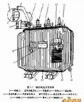 为了使变压器的运行更加完全、可靠,维护更加简单,更广泛地满足用户的需要,近年来油浸式变压器采用了密封结构,使变压器油和周围空气完全隔绝,从而提高了变压器的可靠性。目前,主要密封形式有空气密封型、充氮密封型和全充油密封型。其中全充油密封型变压器的市场占有率越来越高,它在绝缘油体积发生变化时,由波纹油箱壁或膨胀式散热器的弹性变形做补偿。油浸式变压器主要部件是绕组和铁心(器身)。 绕组是变压器的电路,铁心是变压器的磁路。二者构成变压器的核心即电磁部分。 除了电磁部分,还有油箱/冷却装置/绝缘套管/调压和保护装置等部件。其结构如图1-2-6所示,主要部件为: