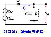 图Z0902是调幅的原理,它由非线性器件和谐振频率为ω0的LC并联谐振回路组成。uC为载波,um为调制电压。由于二极管的伏安特性可以近似地用一个n次多项式来表示,即:io =a0+a1u+a2u2+a3u3+…,系数a0、a1、a2、a3等的大小和符号取决于二极管伏安特性的特点。而该多项式的项数取决于信号u的大小和对分析结果所要求的精确度,信号愈大或者所要求的精确度愈高,所取的项数就应愈多。通常,取前三项就足以反映出二极管的非线形特点,即: