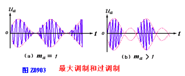 在实际情况中,总是0<ma≤1。ma = 1称为最大调制。若 ma>1,Uamin必为负值,称为过调制,这时调幅波的幅度在一段时间内变为零,其幅度的包络线不再与调制波形成线性关系,出现严重。最大调制与过调制的波形如图Z0903所示,所以应尽量避免过调制,如果ma = 0,则为无调制情况。