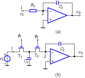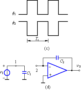 (a)有源RC积分器 (b)开关电容积分器 (c)两相时钟 (d)在f1为高时,vI向C1充电 (e)在f2为高电平时,C1向C2放电 |