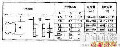 大功率片状绕线型电感器型号不统一,尺寸也不相同,这里仅介绍一种圆形工字形铁氧体骨架构成的电感器,其尺寸、电感量范围及直流电阻范围如表所示:由表可以看出,同一尺寸的骨架可以采用不向直径漆包线来绕制、绕的匝数不同,故其电感量及直流电阻值是一个范围 电阻越小,线径越大尺寸也越大,这是个矛盾。
