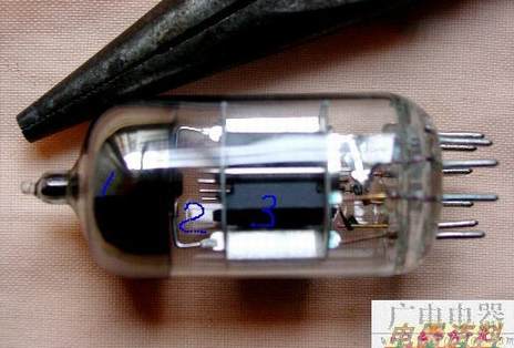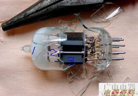 这是颗用于高频放大的通用双三极管6N1。1是吸气剂;2是灯丝阴极和栅极的组合体;3就是阳极。