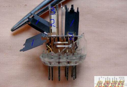 1:阳极;2:栅极,栅极里白色部分是栅极和阴极的绝缘层;3 就是阴极,这是个扁型金属管,灯丝就包在里面啦。
