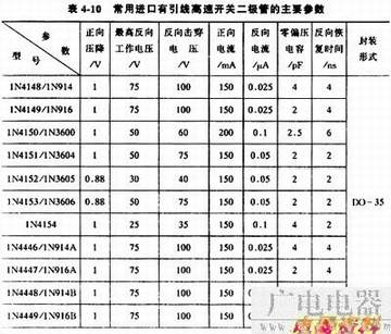 进口高速开关二极管有1N系列、1S系列、1SS系列(有引线塑封)和RLS系列(表面安装),见表4-10和表4-11。