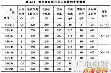 常用的高反压开关二极管有RLS系列(表面封装)和1SS系列(有引线塑封),其主要参数见表4-14。