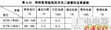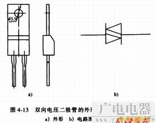 双向电压二极管由NPNPN五层结构的硅半导体材料组成,其正向和反向均具有相同的负阻开关特性。图4-13是双向电压开关二极管的外形图和电路图形符号。表4-15是两种常用硅电压开关二极管的主要参数。
