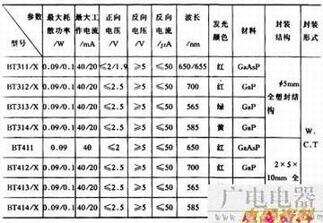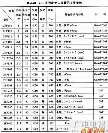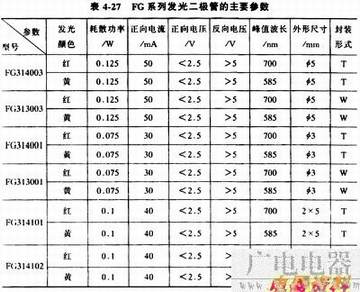 常用的国产普通单色发光二极管有BT(厂标型号)系列、FG(部标型号)系列和2EF系列,见表4-26、表4-27和表4-28。