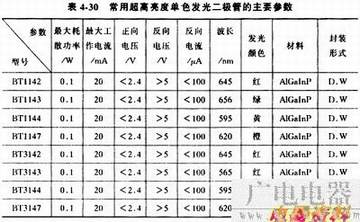 常用的高亮度红色发光二极管的主要参数见表4-29,常用的超高亮度单色发光二极管的主要参数见表4-30。