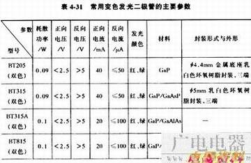 3.变色发光二极管 变色发光二极管是能变换发光颜色的发光二极管。变色发光二极管发光颜色种类可分为双色发光二极管、三色发光二极管和多色(有红、蓝、绿、白四种颜色)发光二极管。