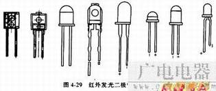 6.红外发光二极管 红外发光二极管也称红外线发射二极管,它是可以将电能直接转换成红外光(不可见光)并能辐射出去的发光器件,主要应用于各种光控及遥控发射电路中。其外形图见图4-29。