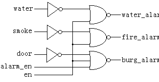 例21:用VHDL设计一家用告警系统的控制逻辑,它有来自传感器的三个输入信号smoke、door、water和准备传输到告警设备的三个输出触发信号fire_alarm、burg_alarm、water_alarm以及使能信号en和alarm_en。VHDL程序描述如下: