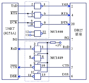 EIA-RS-232C与TTL转换:EIA-RS-232C是用正负电压来表示逻辑状态,与TTL以高低电平表示逻辑状态的规定不同。因此,为了能够同计算机接口或终端的TTL器件连接,必须在EIA-RS-232C与TTL电路之间进行电平和逻辑关系的变换。实现这种变换的方法可用分立元件,也可用芯片。目前较为广泛地使用转换器件,如MC1488、SN75150芯片可完成TTL电平到EIA电平的转换,而MC1489、SN75154可实现EIA电平到TTL电平的转换。MAX232芯片可完成TTL←→EIA双向,图1显示了1488和1489的内部结构和引脚。MC1488的引脚(2)、(4,5)、(9,10)和(12,13)接TTL输入。引脚3、6、8、11输出端接EIA-RS-232C。MC1498的14的1、4、10、13脚接EIA输入,而3、6、8、11脚接TTL输出。具体连接方法如图2所示。图中的左边是微机串行接口电路中的主芯片,它是TTL器件,右边是EIA-RS-232C连接器,要求EIA高电压。因此,RS-232C所有的输出、输入信号都要分别经过MC1488和MC1498转换器,进行电平转换后才能送到连接器上去或从连接器上送进来。