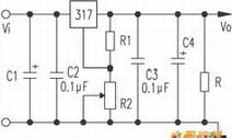 要解决317稳压块最小稳定工作电流的问题,可以通过设定R1和R2阻值的大小,而使317稳压块空载时输出的电流大于或等于其最小稳定工作电流,从而保证317稳压块在空载时能够稳定地工作。此时,只要保证Vo/(R1+R2)≥1.5mA,就可以保证317稳压块在空载时能够稳定地工作。上式中的1.5mA为317稳压块的最小稳定工作电流。当然,只要能保证317稳压块在空载时能够稳定地工作,Vo/(R1+R2)的值也可以设定为大于1.5mA的任意值。