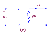 受控源有两对端钮:一对为输入端钮,另一对为输出端钮。输入端钮施加控制的电压或电流,输出端钮则输出被控制的电压或电流。因此,理想的受控源电路有四种,如图1-6-1所示。其中图(a)为电压控制电压源(VCVS),控制量为电压u1;图(b)为电流控制电压源(VS),控制量为电流i1;图(c)为电压控制电流源(VCCS),控制量为电压u1;图(d)为电流控制电流源(CCCS),控制量为电流i1。图中的菱形符号即表示受控源,以与独立源的符号相区别;μ,γ,g和α为有关的控制系数;μ和α为纯树,γ具有量纲,g具有量纲。当这些控制系数为常数时,则为先行受控源。我们以后提到的受控源都是指线性受控源。表征理想线性受控源输出特征的数学方程分别为: