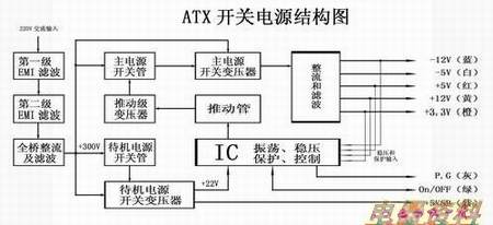 但我们同时注意到,300V直流电加到待机电源开关管和待机电源开关变压器后,由于待机电源开关管被设计成自激式振荡方式,待机电源开关管立即开始工作,在待机电源开关变压器的次级上输出二组交流电压,经整流滤波后,输出+5VSB和+22V电压,+22V电压是专门为供电的。+5VSB加到主板上作为待机电压。当用户按动机箱的Power on启动按键后,(绿)色线处于低,IC内部的振荡立即启动,产生脉冲信号,经推动管放大后,脉冲信号经推动变压器加到主开关管的基极,使主开关管工作在高频开关状态。主开关变压器输出各组电压,经整流和滤波后得到各组直流电压,输出到主板。但此时主板上的CPU仍未启动,必须等+5V的电压从零上升到95%后,IC检测到+5V上升到4.75V时,IC发出P.G信号,使CPU启动,电脑正常工作。当用户关机时,绿色线处于高电平,IC内部立即停止振荡,主开关管因没有脉冲信号而停止工作。-12至+3.3的各组电压降至为零。电源处于待机状态。
