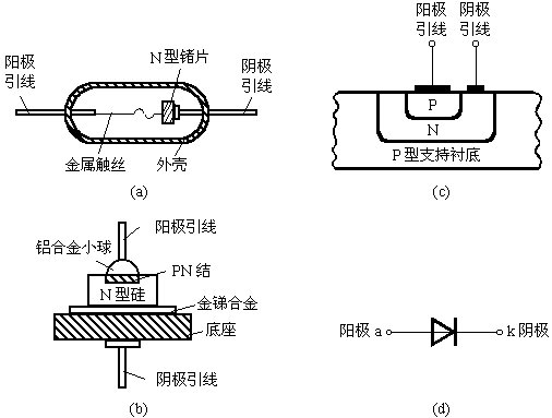 图(c)为中的平面型二极管的结构图,图(d)为二极管的代表符号。