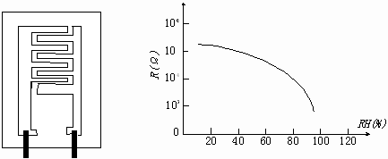 图2.5.3是氯化锂湿敏电阻的结构图。它是在聚碳酸酯基片上制成一对梳状金电极,然后浸涂溶于聚乙烯醇的氯化锂胶状溶液,其表面再涂上一层多孔性保护膜而成。氯化锂是潮解性盐,这种电解质溶液形成的薄膜能随着空气中水蒸汽的变化而吸湿或脱湿。感湿膜的电阻随空气相对湿度变化而变化,当空气中湿度增加时,感湿膜中盐的浓度降低。