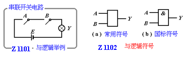 | 逻辑用到的基本逻辑关系有与逻辑、或逻辑和非逻辑,相应的逻辑门为与门、及。 一、与逻辑及与门 与逻辑指的是:只有当决定某一事件的全部条件都具备之后, 该事件才发生,否则就不发生的一种因果关系。如图Z1101所示电路,只有当开关A与B全部闭合时,灯泡Y才亮;若开关A或B其中有一个不闭合,灯泡Y就不亮。这种因果关系就是与逻辑关系,可表示为Y=A B,读作"A与B"。在逻辑运算中,与逻辑称为逻辑乘。 与门是指能够实现与逻辑关系的门电路。与门具有两个或多个输入端,一个输出端。其逻辑符号如图Z1102所示,为简便计,输入端只用A和B两个变量来表示。 与门的输出和输入之间的逻辑关系用逻辑表达式表示为: Y=A·B=AB 两输入端与门的真值表如表Z1104所示。波形图如图Z1103所示。由此可见,与门的逻辑功能是,输入全部为高时,输出才是高电平,否则为低电平。