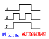 二、或逻辑及或门 或逻辑指的是:在决定某事件的诸条件中, 只要有一个或一个以上的条件具备,该事件就会发生;当所有条件都不具备时,该事件才不发生的一种因果关系。如图Z1104所示电路,只要开关A或B其中任一个闭合,灯泡Y就亮;A、B都不闭合,灯泡Y才不亮。这种因果关系就是或逻辑关系。可表示为:Y=A+B,读作"A或B"。在逻辑运算中或逻辑称为逻辑加。 或门是指能够实现或逻辑关系的门电路。或门具有两个或多个输入端,一个输出端。其逻辑符号如图Z1105所示。 或门的输出与输入之间的逻辑关系用逻辑表达式表示为: Y=A+B GS1104 两输入端或门电路的真值表和波形图分别如表Z1105和图Z1106所示。 表 Z1105
