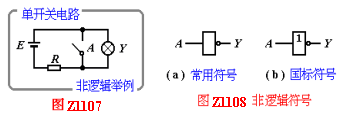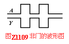 三、非逻辑及非门 非逻辑是指:决定某事件的唯一条件不满足时, 该事件就发生;而条件满足时,该事件反而不发生的一种因果关系。如图Z1107所示电路,当开关A闭合时,灯泡Y不亮;当开关A断开时,灯泡Y才亮。这种因果关系就是非逻辑关系。可表示为Y= 非门是指能够实现非逻辑关系的门电路。它有一个输入端,一个输出端。其逻辑符号如图Z1108所示。 非门的输出与输入之间的逻辑关系用逻辑表达式表示为 Y= 其真值表和波形图分别如表Z1106和图Z1109所示。 由此可见,非门的逻辑功能为,输出状态与输入状态相反,通常又称作器。(表Z1106)