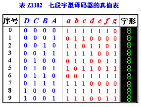Z1303(b)所示。七段LED又有共阴连接和共阳连接二种方式,如图Z1303(c)所示,图中的a~g为段信号输入端,以保证能按要求使相应的LED发光。图中的D为位信号输入端, 借以确定该位的数码管是否能发光。例如,在共阴接法中,当D接高电位时,数码管不会发光;在D接低电位时,数码管才可能发光。BCD─七段LED(共阴)译码器的真值表如表Z1302所示,这里,某段输入信号为"1"时,该段LED发光,且伪输入当任意项处理。由上表并经化简,可得a~g段的最简式为: