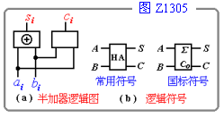 用和与门构成的半加器以及半加器的逻辑符号,分别如图Z1305(a)、(b)所示。