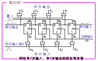 数码寄存器可由RS、D和JK组成。图Z1501是一个由D触发器组成的四位数码寄存器的逻辑图。![]() 若数码A4、A3、A2、A1已被送到相应触发器的D端,当寄存指令(正脉冲)来到后,数码送入触发器。四个触发器输出端Q4、Q3、Q2、Q1的分别等于输入端D4、D3、D2、D1的电平,这时数码A4A3A2A1就被寄存起来。只要没有新的寄存指令,触发器的状态就不会改变,换言之,数码A4A3A2A1在寄存器中一直保持到下一个寄存指令到达时为止。 显然,图Z1501所示的寄存器采用了并行输入--并行输出的方式。 ![]() |