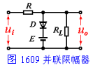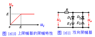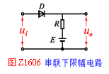 图中,当ui高于E时,D导通,uOs=E;当ui低于E时,D截止,uO=ui。它的限幅特性如图Z1610所示。显然,这是一个上限幅器。