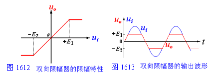 将上、下限幅器组合在一起,就组成了如图Z1611所示的双向限幅电路,它的限幅特性如图Z1612所示。当输入一个振幅较大的正弦信号时,输出波形见图Z1613。