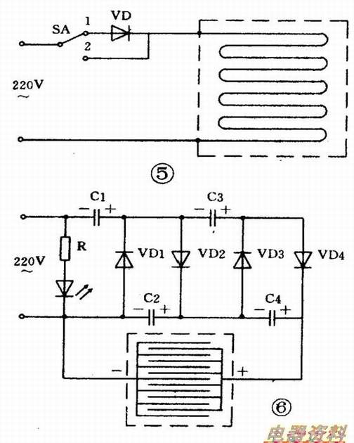 例l 电热毯控温电路图5是一个电热毯电路。开关在“1”的位置是低温档。220伏市电经二极管后接到电热毯,因为是半波整流,电热毯两端所加的是约l00伏的脉动直流电,发热不高,所以是保温或低温状态。开关扳到“2”的位置,220伏市电直接接到电热毯上,所以是高温档