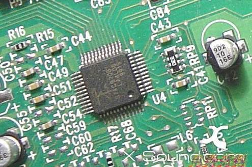 受AC'97白皮书技术约束的Codec就是AC'97 Codec,AC'97 Codec和音频加速器使用AC-Link通讯,现在目前市面上的大部分声卡,包括板载的软卡,都不同程度的受AC'97规范约束,为什么说不同程度呢,因为AC'97不是一个强制性的规范,在不少声卡当中,仅仅接受了部分AC'97标准而已,例如:CREATIVE Sound Blaster Audigy2。AC'97是一个出于节省成本的规范,规范中约定了不少有损音质的操作,例如(Sample Rate Convertor采样转换器)。AC'97 Codec一般采用48封装,4面有引脚,每面12个,非常好识别。我们来看看常见声卡上的AC'97 Codec是什么样子。
