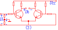 | 下面我们对它们进行分析一下(只对图(1)所示的电路进行分析) 它的传输特性如图(3)所示: 它表明:输入电压从低逐渐升高经过UR时,uo将从高电平变为低电平。相反,当输入电压从高逐渐到低时,uo将从低电平变为高电平。 |
