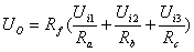 | 它的电路图如图(3)所示: 此电路的功能是对Ui1、Ui2进行反相求和,对Ui3、Ui4进行同相求和,然后进行的叠加即得和差结果。 | |