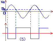 | 阈值电压:我们将比较器的输出电压从一个电平跳变到另一个电平时对应的输入电压的值。它还被称为门限电压。简称为:阈值。用符号UTH表示。 利用简单电压比较器可将正弦波变为同频率的方波或矩形波。 例:电路如(1)所示,输入电压为正弦波如图(4)所示,试画出输出波形