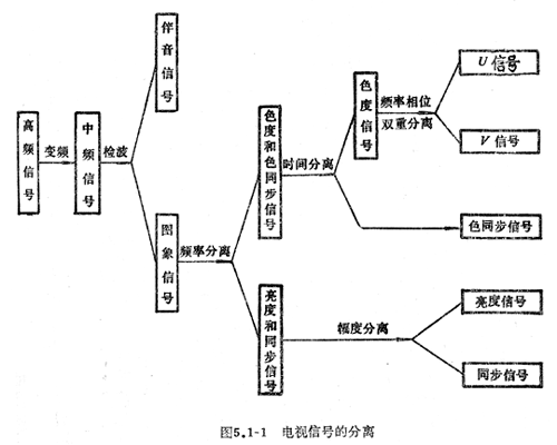电视台播送的高频电视信号的时域波形和频谱图分别如图4.7-3和图4.7-5所示。微弱和高频电视信号必须先经过高频放大、变频、中频放大和视频检波后,才能变成具有一定幅度的彩色全电视信号;然后根据亮度信号、色度信号、同步信号和色同步信号在时域和频域中的特点,利用它们在频率、、时间、幅度等方面的差异进行分离,如图5.1-1所示。例如:①视频检波后,图象信号(0~6M)和伴音信号(6.5MHz)可进行频率分离;②亮度信号(0~6MHz)和色度信号(4.43±1.3MHz)可进行频率分离;③亮度信号和复合同步信号,可以进行幅度分离;④色度信号(行正程)和色同步信号(行逆程)可进行时间分离;⑤μ和υ色度信号在频率和相位上不一致,可进行频率、相位双重分离等等。