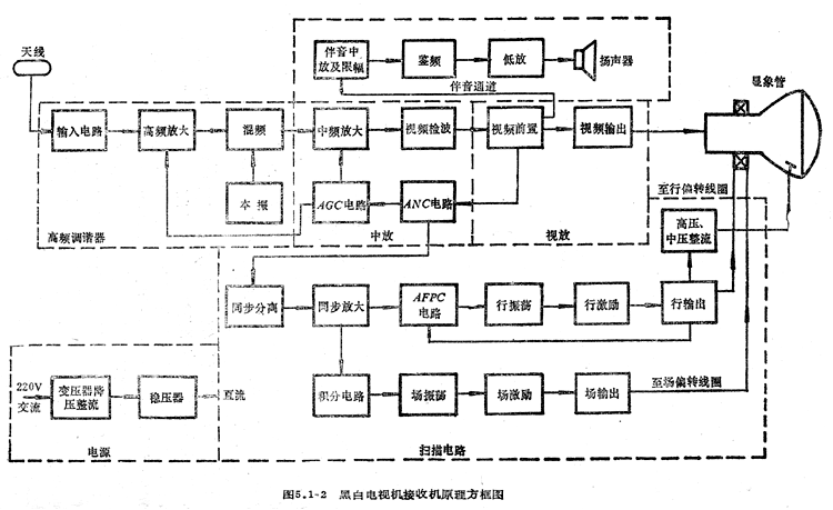 图1.5-2示出分立元件黑白电视接收的方框图。主要由信号通道(包括高频头,中放,视放和伴音通道),扫描电路(包括同步分离,场、行扫描电路)和三部分组成。