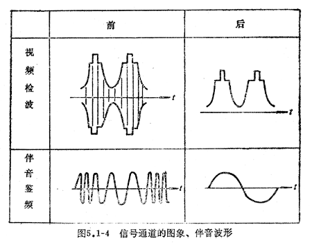 图5.1-4示出视频检波前后的图象信号。检波前为图象载频信号,混频级前后的载频分别为图象载频与图象中频;检波后为图象视频信号。该图还示出伴音鉴频前后的伴音信号波形。鉴频前为调频信号,从天线至混频的载频为伴音载频,混频至检波为伴音第一中频,检波至鉴频为伴音第二中频。鉴频后为伴音的音频信号。