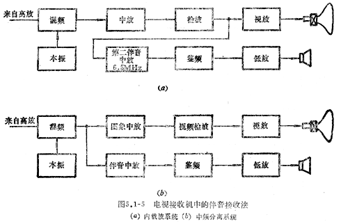 超外差又分为单通道和双通道两种方式,如图5.1-5所示。其差别在于图象信号和伴音信号的分离点不同,前者在视频检波之后才分离,后者在混频之后就分离。在单通道方式中,图象中频和伴音第一中频公用一个通道进行放大,同时加入视频检波器,检波器除检出视频图象信号外,还使图象中频和伴音中频差拍产生第二伴音中频信号(例如6.5MHz)。因此,单通道方式亦称为伴音内载波方式。它与双通道方式相比,其优点是当高频头的本振频率发生偏移后,第二伴音中频始终保持不变,从而避免了鉴频。而双通道则不然,本振频率的偏移引起伴音中频30.5MHz的偏移,使以30.5MHz为中心频率的鉴频器工作在严重的不对称状态,引起伴音的音频信号波形严重失真。