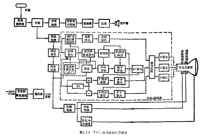 图5.1-6为PAL制彩色电视接收机的方框图,它与黑白机有许多相同的地方,其主要不同点是了器和彩色显象管的附属电路,另外彩色显象管取代了黑白显象管。