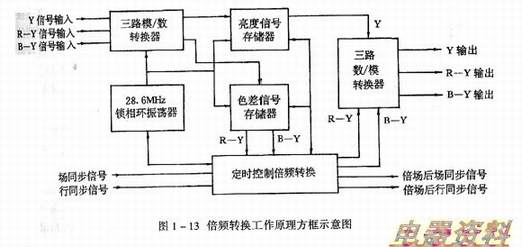 100Hz扫描电路主要由视频存储器、模数转换电路(ADC)、数模转换电路()、倍频转换电路及时钟控制电路等组成,如图1-13所示。在低场频制式电视中,主要是图像闪烁易使人们的视觉疲劳,因此,倍场频的关键技术是如何使图像中的亮度(Y)信号和色差(R-Y、B-Y)信号完成数字格式的场倍频转换。
