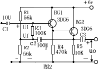 | 图3是串接式的跟随器,其特点是:(1)类似图2一样,R4两端交流电压具有自举作用;(2)BG2采用共基接法,使2具有恒流作用,A、B两点交流阻抗RAB大大也提高,从而提高了跟随器的输入阻抗。 |