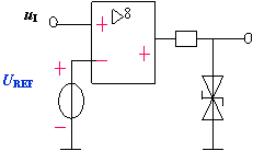 原理:标准信号为UREF,uI为待比较的输入电压。集成运算放大电路工作在开环状态,具有很高的开环电压增益,故工作于非线性区。